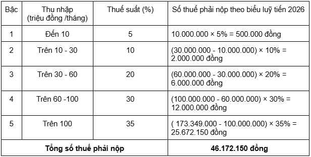 Như vậy, cách tính thuế TNCN 2026 với biểu thuế lũy tiến từng phần 5 bậc công thức như sau: