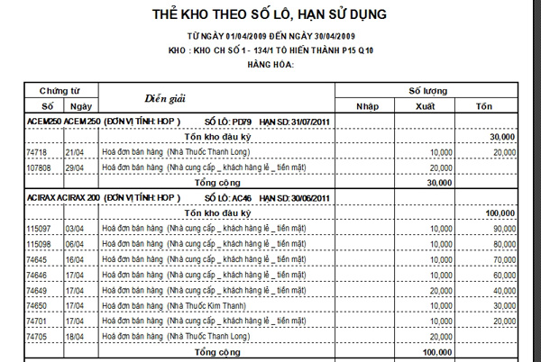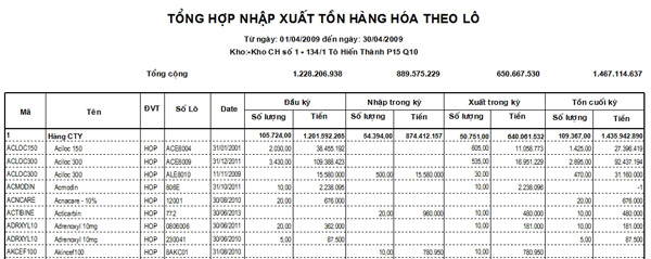 - Cung cấp báo cáo theo dõi hàng hóa theo lô, hạn sử dụng thuốc: Báo cáo thẻ kho, Sổ chi tiết hàng hóa, báo cáo Nhập xuất tồn