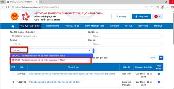 Bước 2: Sau khi đăng nhập hãy vào mục Thủ tục hành chính => Tờ khai => Tìm kiếm "01/CNKD" => lựa chọn mẫu 01/CNKD theo TT40 => Tìm kiếm.