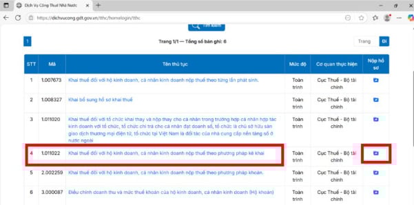 Bước 3: Đối với Hộ kinh doanh nộp thuế theo phương pháp kê khai thì chọn mã 1.011022.