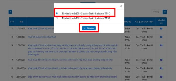 Kế tiếp, chọn "Tờ khai thuế đối với cá nhân kinh doanh T40" => Nhấn “Tiếp tục”.