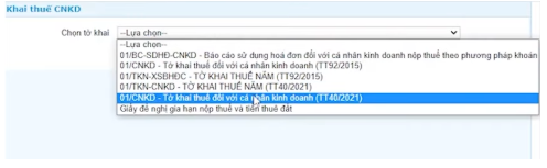 Bước 6: Chọn loại tờ khai “ Mẫu 01/CNKD – Tờ khai thuế đối với cá nhân kinh doanh (TT40/2021)” => lựa chọn kỳ khai thuế (theo tháng hoặc quý) rồi nhấn “Tiếp tục”.