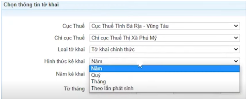 Bước 6: Chọn "Hình thức kê khai (Tháng/Quý)” => Chọn tháng/quý kê khai=> nhấn "Tiếp tục".