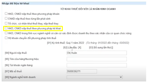 Bước 7: Tại màn hình sẽ xuất hiện tờ khai, người nộp thuế chọn hình thức: HKD, CNKD nộp thuế theo phương pháp kê khai. Sau đó kê khai đầy đủ các thông tin định danh cùng thông tin xác định nghĩa vụ thuế.