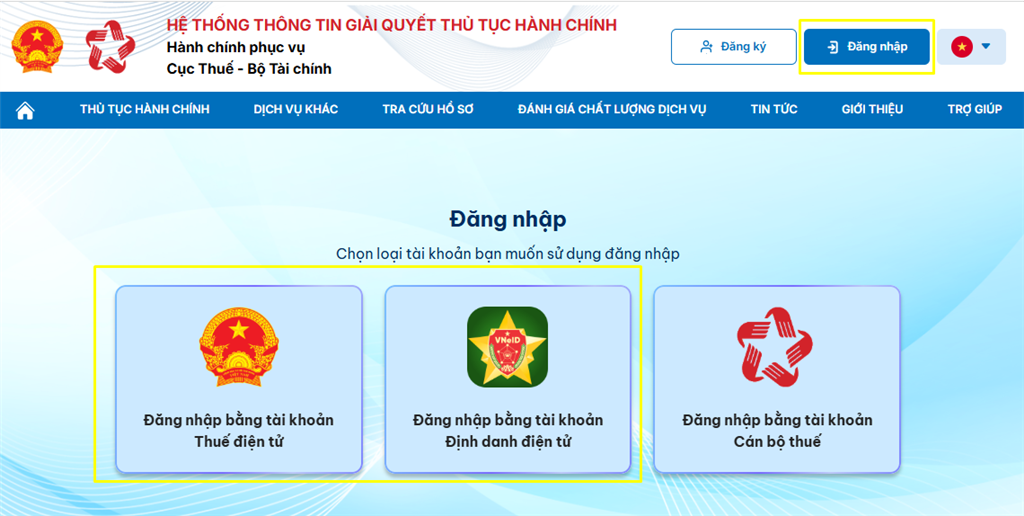 https://dichvucong.gdt.gov.vn/ => chọn “ Đăng nhập” => chọn đăng nhập bằng tài khoản Thuế điện tử hoặc tài khoản Định danh điện tử.