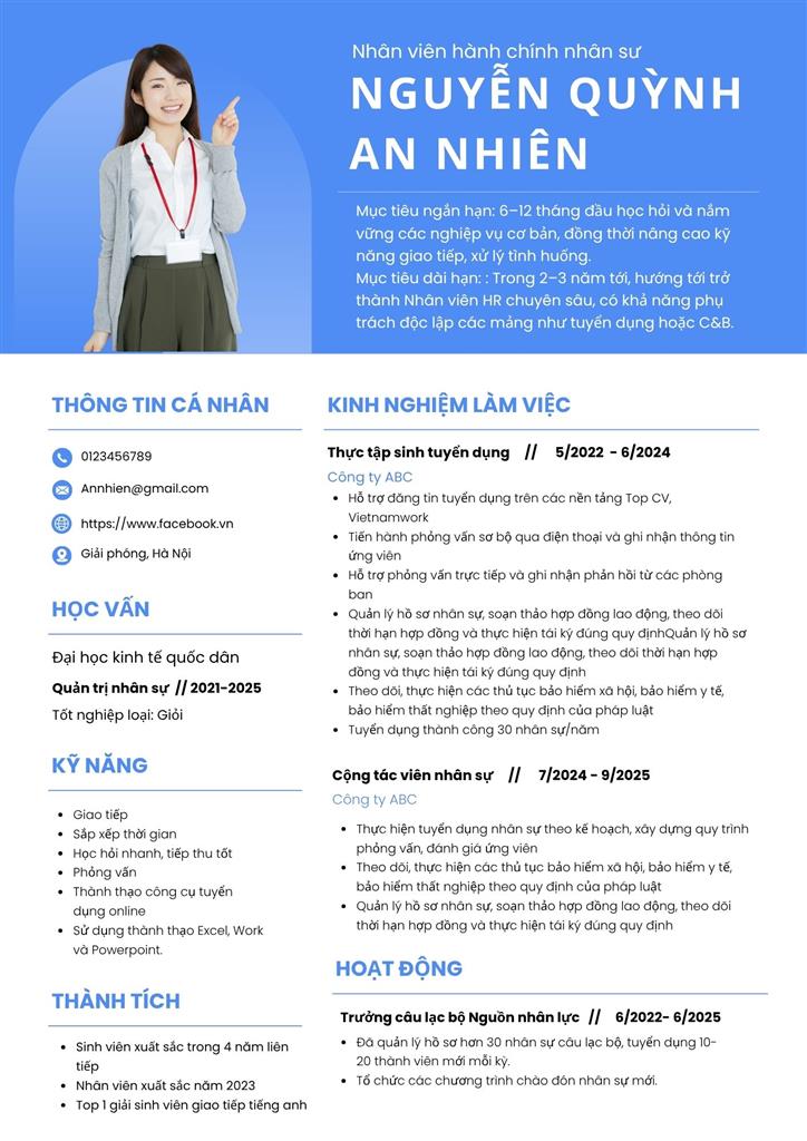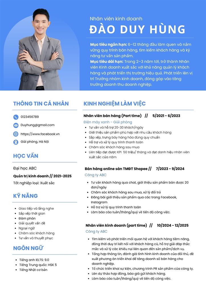 Kinh nghiệm làm việc: Với ứng viên mới, kinh nghiệm không nhất thiết phải là công việc chính thức. Có thể đưa vào các công việc bán thời gian, thực tập hoặc dự án đã tham gia.