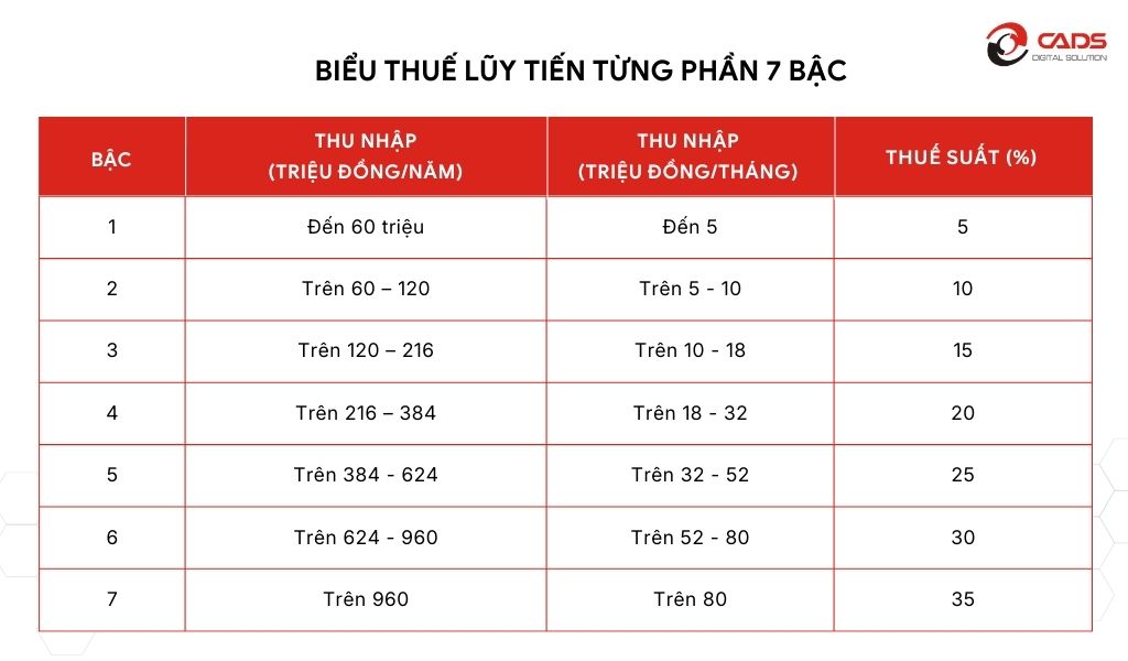 Đối với kỳ quyết toán năm 2025, áp dụng biểu thuế lũy tiến 07 bậc theo Luật Thuế thu nhập cá nhân số 04/2007/QH12.
