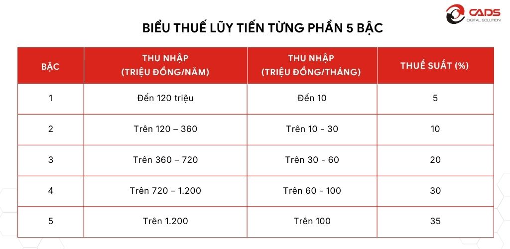 Đối với kỳ tính thuế năm 2026, theo luật thuế TNCN số 109/2025/QH15 áp dụng biểu thuế lũy tiến từng phần gồm 5 bậc thuế có hiệu lực thi hành từ 01/7/2026.