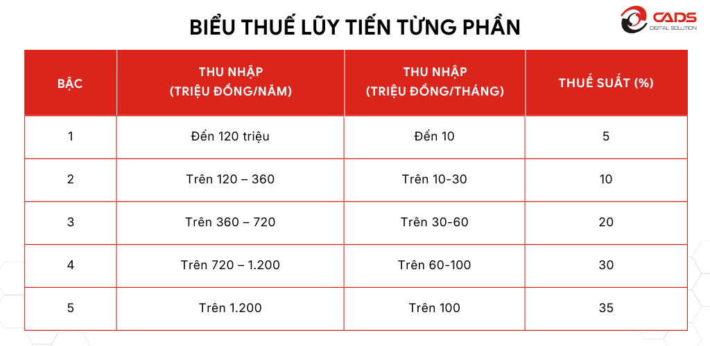 - Áp dụng biểu thuế lũy tiến từng phần 5 bậc với thu nhập cá nhân từ tiền lương, tiền công.