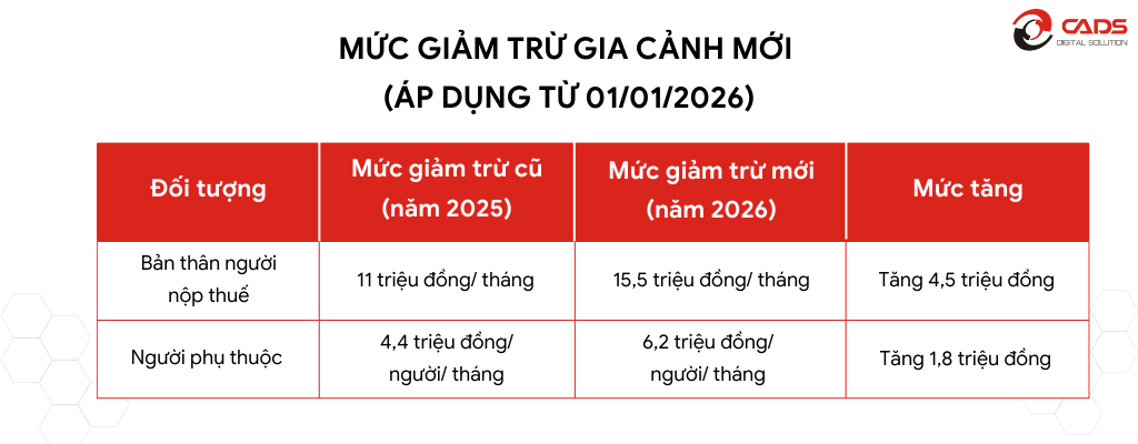- Tăng mức giảm trừ gia cảnh từ 01/01/2026: giảm trừ cho bản thân người nộp thuế: 15,5 triệu đồng/tháng (tương đương 186 triệu đồng/năm); giảm trừ cho mỗi người phụ thuộc: 6,2 triệu đồng/tháng.