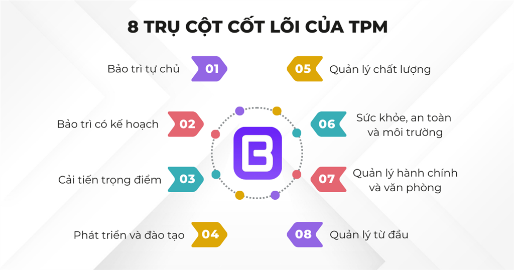 Hệ thống TPM được xây dựng dựa trên 8 trụ cột, mỗi trụ cột đảm nhận một vai trò riêng nhưng có sự liên kết chặt chẽ với nhau, tạo thành một hệ thống bảo trì toàn diện.
